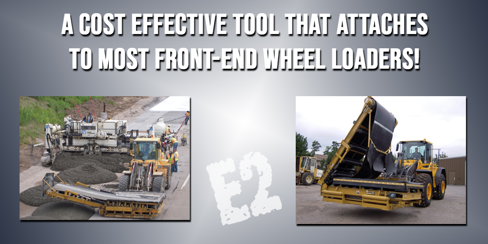 The Portable Modular Conveyor-Material Placer by E2 Systems, LLC is a cost effective tool that attaches to most front-end wheel loaders equipped to accept attachments and with third valve control. The conveyor belt is operated with loader hydraulic controls and powered by the wheel loader. It has a proven record of placing 300 cyds of concrete per hour, outperforming the standard material-transfer placer systems two to one at 1/4th the cost.